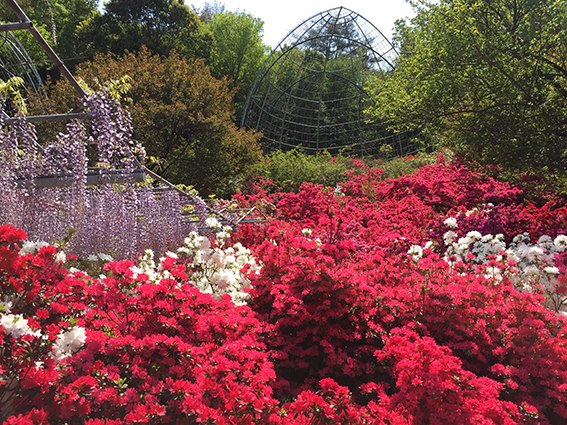 園内では、しゃくなげやつつじも彩りを添え、藤の淡い色合いに鮮やかなアクセントを与えています。藤・しゃくなげ・つつじが一度に楽しめるのは、この季節ならでは。春の息吹を全身で感じられる、心華やぐ散策をお楽しみください。