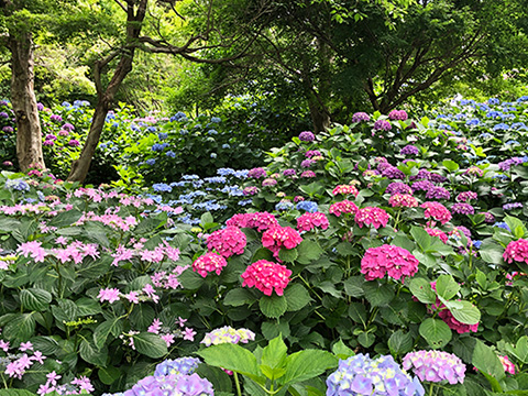 名前は「可睡ゆりの園」ですが、実はアジサイもたくさん咲いていて見逃せません。特に斜面一面に広がるアジサイが見事で、高低差のおかげでカメラを構えると水色の花が画面いっぱいに広がります。