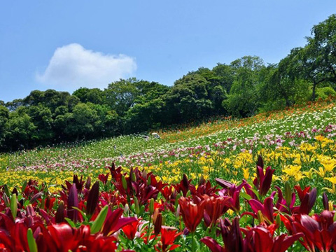 3万坪の広々とした園内はなだらかな斜面や森や池などがあり、見る場所や角度により様々な景色と出会えます。