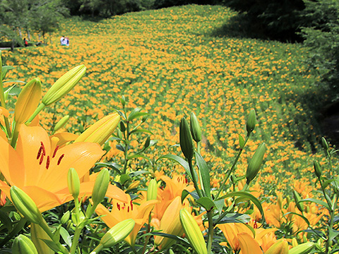 可睡斎の東側丘陵地3万坪に広がる可睡ゆりの園には、毎年5月下旬から7月上旬にかけて、回遊式の日本庭園の池を囲むように、様々な品種のゆりが順次に咲き競います。